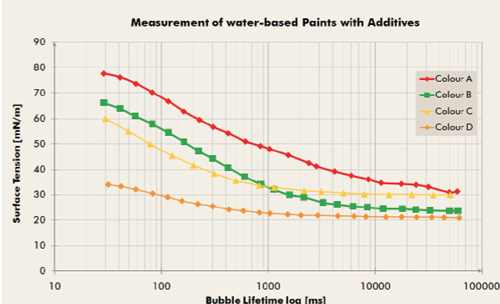SITA的界面張力儀是基于氣泡壓力法,測試通過從一個高動態到準靜態的過程。尤其是SITA的t60/2界面張力儀,更是適合實驗室應用,它是從30毫秒的氣泡壽命時間開始測試。因此,取決于氣泡壽命時間的色漿的表面張力的測試,是為了更好地讓表面張力在某個氣泡壽命時間達到特定的值,而這個氣泡壽命時間是正式客戶要求達到潤濕的時間。