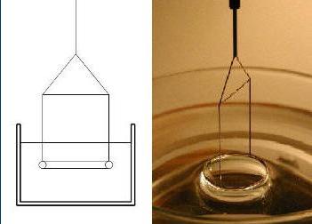 靜態表面張力如拉環法,是利用一個初始浸在液體的環從液體中拉出一個液體膜,測量環脫離液面時需要施加的力來計算出表面張力。