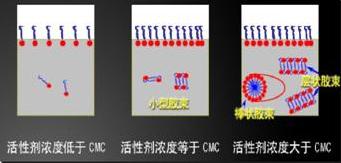 1、溶液中的表面活性劑濃度在臨界膠束濃度(CMC)以下,這時,靜態表面張力隨時表面活性劑濃度的增大而減少,如上圖的斜線部份。