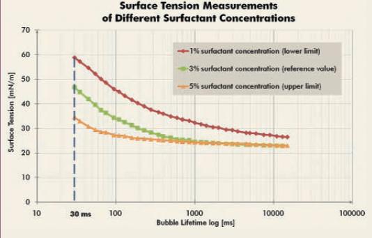 另外,動態表面張力與流平、重涂性能、縮邊也有很大關系,動態表面張力儀可協助解決各種與表面張力有關的問題。因此使用鼓泡法動態表面張力儀,可以測出不同表面活性劑濃度時的表面張力變化,從而指導生產或研發。